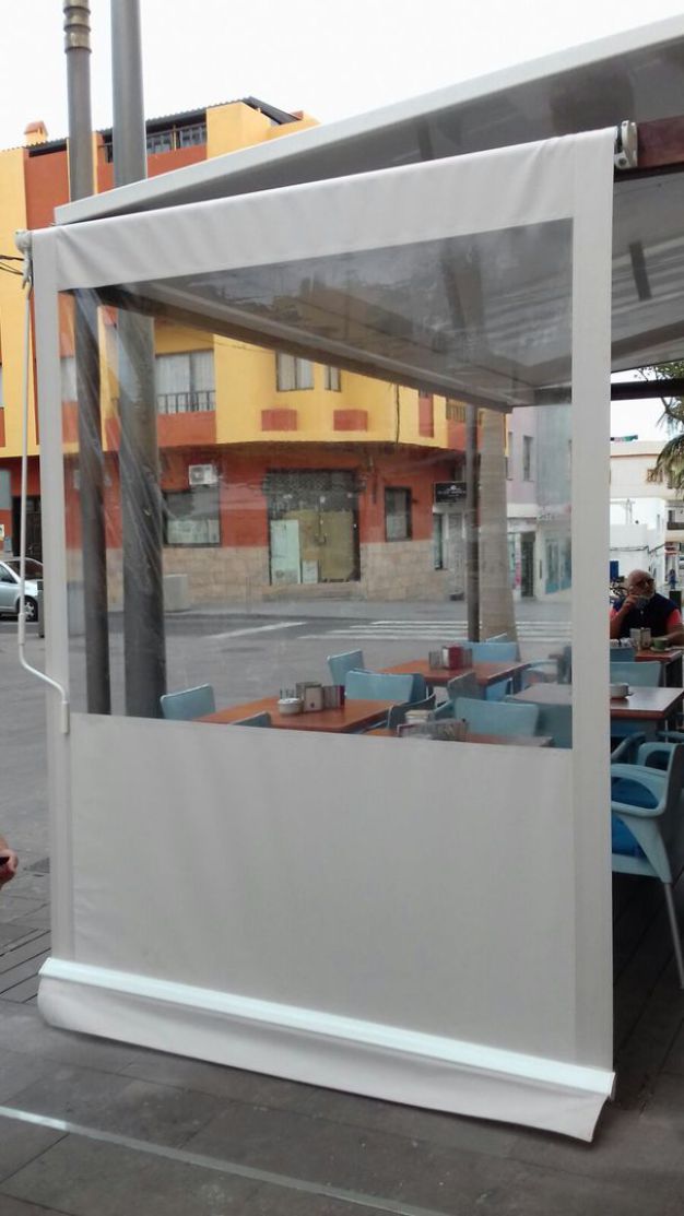 Toldo bajante vertical cortavientos con guias antiviento y ventana transparente y perfiles intermedios de renfuerzo y con cierre por medio de cerrojos en acero inox